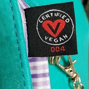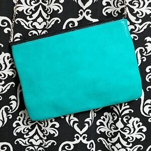 Urban Expressions certified vegan crossbody bag has removable chain strap, can wear as a clutch, just absolutely bold and gorgeous, color-block in real -please note this is not turquoise see 7th pic for true color, and black, clasps and zippers all work, excellent condition there is one tiny red mark inside zipper pouch, not noticable to anyone! Imprinted with animal design