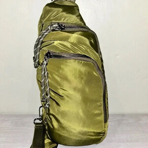 This adorable, fashionable and functional Sling backpack is made by urban expressions. Beautiful olive green color. detachable and adjustable sling backpack strap, top carry handle, and dual compartment design make this mini sling backpack perfect for your busy on the go, life. dual compartment design with inner and outer zip pocket. Made of nylon. Interior slip pocket and zipper closure. This backpack is lightweight and sits comfortably on your shoulder. Durable and well-made. Perfect for outdoor activities, travel, work or school. Brand new with tags.