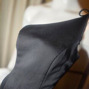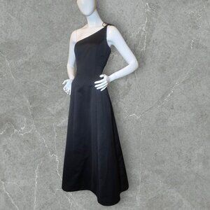 Vintage 90's / early Y2K URBAN GIRL NITES- Women's black polyester sateen one shoulder maxi prom or cocktail dress. Fitted bodice, fitted waistline. Classic style with princess seams, acetate lining, crinoline under the skirt for fullness. Zipper back closure. Very good pre-owned condition.