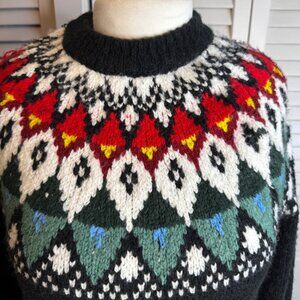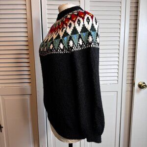 Black with multicolored fair isle, puff sleeves, oversized fit, Nordic vibes, warm and cozy, pit to pit 23.5”, length 27”
