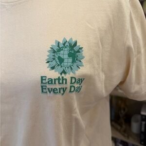 Cream t-shirt featuring a green 'Earth Day Every Day' graphic. I think it’s unisex