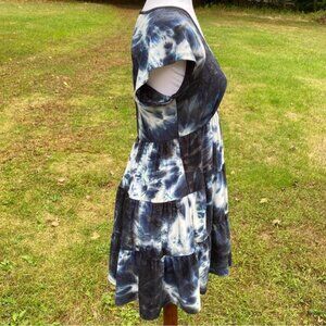 URBAN OUTFITTERS MINI DRESS BLACK BLUE WHITE TIE DYE BOHEMIAN HIGH WAIST V-NECK TIERS CAP SLEEVE