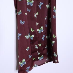 Get ready to flutter in this cute mini slip dress! Made from a silky satin fabric with an all-over butterfly print on a maroon background. It's got a cowl neck with adjustable spaghetti straps and zips up the back.