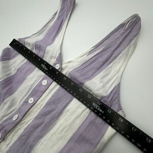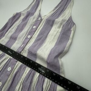 Elevate your style with this beautiful Urban Outfitters dress. This purple and white striped dress features a flattering v-neckline and strappy sleeves, making it perfect for any occasion from workwear to parties. The button front and pleated accents add a touch of elegance, while the pockets provide practicality. Made with a blend of rayon and linen, this midi-length dress combines comfort and style. The A-line silhouette and sleeveless design make it a great option for layering in any season. Whether you're attending a wedding or running errands, this dress is a versatile choice that will make you look and feel great.