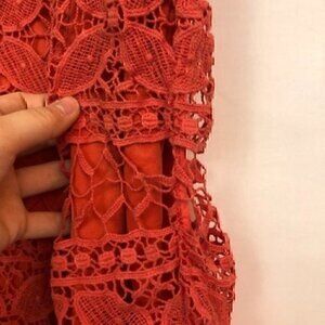 Tikirani Crocheted Camisole from Urban Outfitters. Size small solid coral red floral flower crochet lace overlay boho sleeveless tank top. Lined. 100% cotton; lining: 100% polyester. No flaws found other than some fraying/ripped threads in overlay as shown; smallish darker spot on collar; minor unnoticeable runs/snags possible.