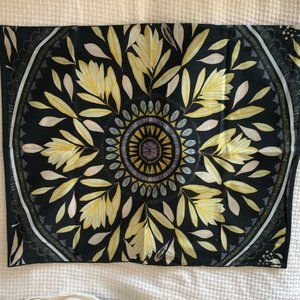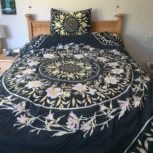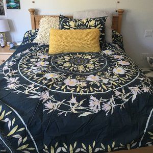 navy/yellow/white floral mandala twin comforter + sham set. gently used for less than a year. we have accompanying pillows, tassel wall hangings (with original fabric from the comforter), and a lamp as well for sale.