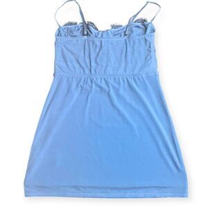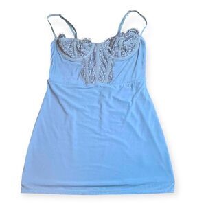 This flirty and feminine Brenna bustier mini dress from Urban Outfitters is crafted in a soft dusty periwinkle hue. Featuring lace detailing along the bust, a fitted bodice with corset-inspired seaming, and adjustable spaghetti straps.