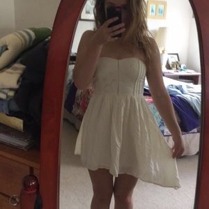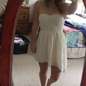 Strapless creme dress from Kimchi Blue by Urban Outfitters. Embroidered top and sweetheart neckline. Uneven bottom is super unique. It's longer on the right side and shorter on the left. I love this dress, but it's just a bit too small.