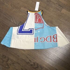 Sporty tank top from BDG made from spliced mesh basketball jerseys. Loose fit that's cropped above the waist with a high neckline.