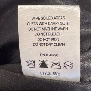 Care: WIPE SOILED AREAS CLEAN WITH DAMP CLOTH, DO NOT MACHINE WASH, DO NOT BLEACH, DO NOT IRON, DO NOT DRY CLEAN