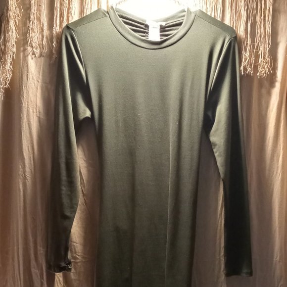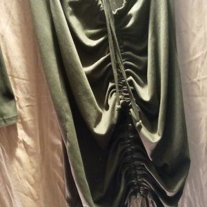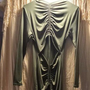 Dark green dress size large. (runs small ) triangle shape empty space in the back. Medium length sleeves. Pull able string to shape size of back of empty.