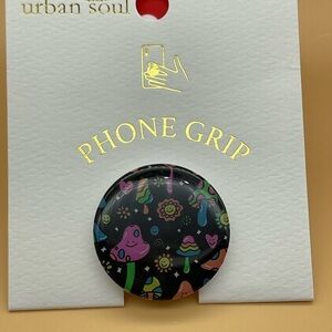 Urban Soul Mushroom Phone Grip. Pop grip. Graphic across top. Sticks to most devices and cases. Imported.