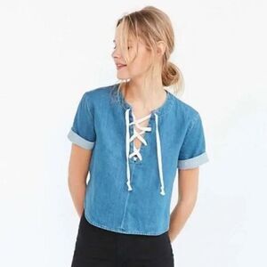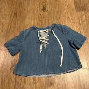 This is an Urban Outfitters BDG Tavi Lace Up Denim Chambray Crop Top in great lightly used condition! The only flaw is some light stains on the lace which have been since bleached out. There is some fading across the front, so just please be sure to review all the pictures! Features: "Tavi" style, lace up with split sides, chambray/denim crop top, short sleeve