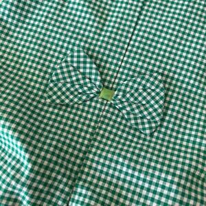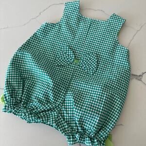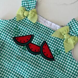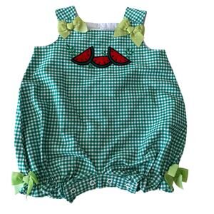 This adorable baby romper features a delightful watermelon appliqué on a green gingham background. The bubble romper design is fully lined for comfort and includes a cute bow detail. It's in excellent condition and perfect for your little one! This romper is size 3-6 months. This delightful watermelon romper is sure to bring smiles and sunshine to your baby's day!