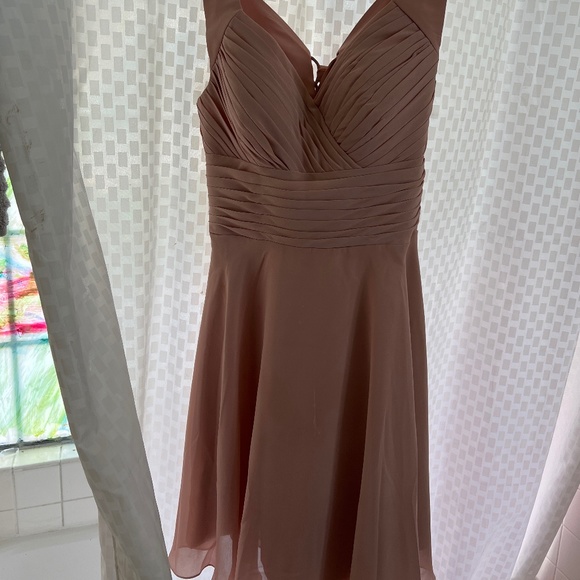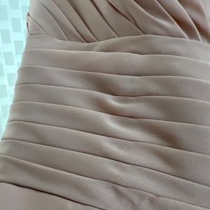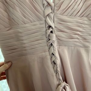 Blush color I believe, chiffon type of fabric over a silky lining. Has boob pads/support and a corset back with a flap to cover the skin from showing beneath the corset.