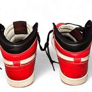 Nike Air Jordan 1 Retro High OG “Heritage” in well-worn condition; classic white/red blocking with black collar. Noticeable use: heavy toe creasing, scuffs on overlays/midsoles, outsole wear, sockliner lint, small marker mark on outsole; structure intact and fully wearable. Smooth leather upper, Nike Air nylon tongue, Wings logo; style code 555088-161. Easy with denim, cargos, or a varsity jacket. Measurements: insole length 10.25 in (deriv from tag 26 cm). Tags: air jordan 1, heritage, aj1 retro high og, 555088-161, university red, white red black, nike air, us 8, uk 7, eu 41, streetwear, basketball shoes, classic sneaker. Eco-plus ready packaging. Ships Mon–Sat in recycled packaging, includes Smarties + handwritten thank-you.