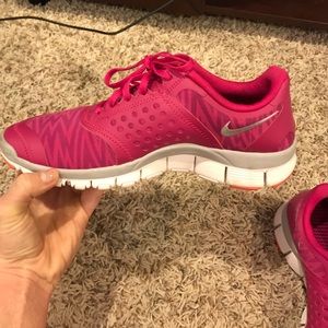 Dark pink/magenta color with grey and white soles. Super cute stripped/zig-zag pattern. I worn them once, threw the box away and haven't worn them since. Excellent condition. Who doesn't love new workout shoes?! Will consider all reasonable offers. ☺️