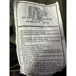 This US Army Woodland Camo M-65 Field Jacket, size Small Regular, is a vintage piece from 1983 that will make a great addition to any collection. Made of 100% cotton, this jacket features a camouflage pattern in green with a hood and is perfect for winter, fall, and spring. The jacket is branded USGI and has a military style with a colorful theme.