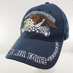 U.S. Air Force "We Own the Skies" embroidered strapback adjustable hat cap via Eagle Crest - unworn hat with minor 1" light-ish area on inside brim sweatband section. Ships safely in a secure box :)