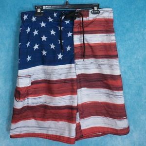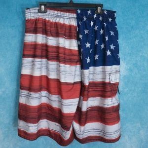 Get ready for some patriotic surfing with these U.S. Apparel Board Shorts! Made with 100% polyester and machine washable , these multicolored shorts feature the iconic USA flag design with stars and stripes. The elastic waistband and drawstring ensure a comfortable fit, while the lined interior , hook and loop fly , and side pocket provide both practicality and style. Perfect for recreational surfing or any water-based activity, these board shorts are a must-have for any patriotic man's wardrobe.