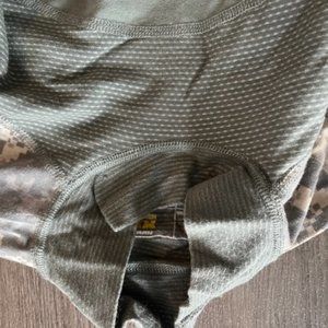 The combat shirt has a loose turtle neck collar to help protect the neck when worn under body armor. The sleeves and shoulders are camo and stretchy, while the main body is a breathable stretch material. On thearm there are velcro area for ID patches. You'll find reinforcing material at the elbows that'll make you think of a basketball that helps keep that area from wearing out and provides extra grip when shooting in the prone. ight.