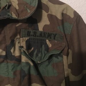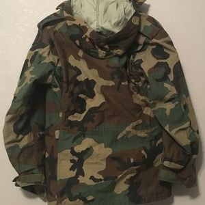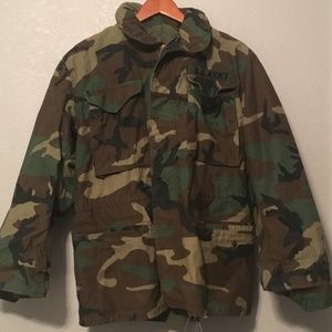 US Army Heavy Duty Military Jacket/Parka with patches intact. Hideaway hood. Has adjustable waist strings to tighten. Excellent Condition.
