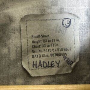 field utility uniform coat, camo pattern with button front and US Army patch, men’s size s, military combat style, made in USA, good condition