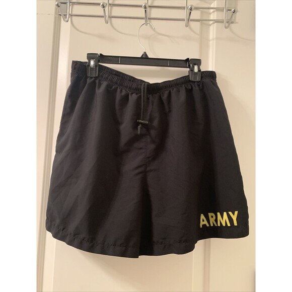 US Army Shorts Mens Size Large Black Yellow PT Training IPFU Lined Running Uniform in great overall condition. The lettering has peeled in areas and the drawstrings have been cut some.