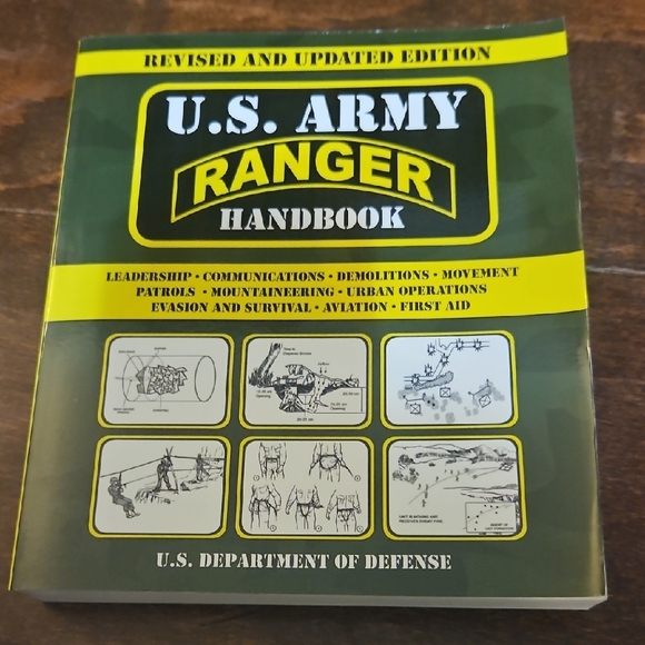 U.S. Army Ranger Handbook with a green and yellow cover. Includes leadership and survival tips.