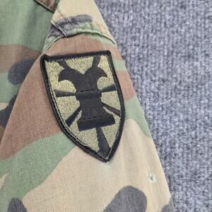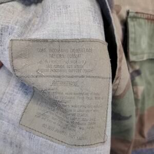 Condition: This U.S. Army Woodland Camouflage Pattern Combat Coat is missing a button on the right arm and has blemishes on both sleeves as pictured.