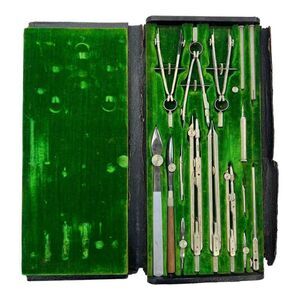 Drafting, Drawing Tools Set. This is in really good condition for its age. Leather bound cover is worn and falling apart. Inside felt is in very good condition and all the tools/equipment is accounted for.