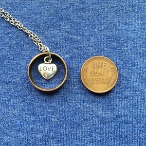 A handmade coin ring necklace made from a US Copper Wheat Penny. It has a natural copper patina and is coated with ProtectaClear to maintain the current finish. In the center is a Tibetan Silver Love Heart. It is hanging on an 18 inch Stainless Steel Chain. Date is not visible.