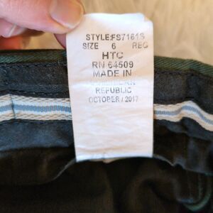 Creased forest green slacks with rubberized inner waistband to keep shirt in place, zip fly with hook and bar closure, four functional pockets