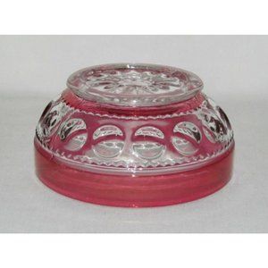 This is a nice crystal with ruby stain round finger bowl in the Kings Crown pattern. It was made by the U.S. (Tiffin) Glass Co. It measures 5 inches across the top and 2 3/8 inches deep. It has double flashing.