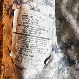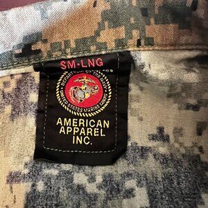 keywords: USMC blouse, MARPAT camo shirt, military uniform, camouflage jacket, American Apparel, insect repellent clothing, outdoor apparel, woodland camo, small long shirt, cotton nylon blend, durable military wear, button-down camo, chest pocket shirt, adjustable sleeve shirt