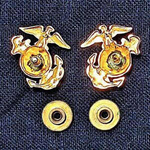 Older (WWII–Vietnam era) USMC EGA (Eagle, Globe & Anchor) collar insignia typically used clutch-back pins or earlier dome-nut screw backs, but the modern threaded post with a flat circular screw plate like yours is associated with newer, mass-produced versions (often post-1990s).
