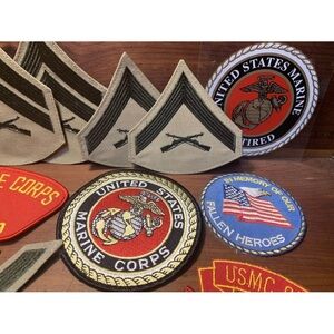 Collection of US Marine Corps patches. Includes various designs and insignias. Perfect for collectors or military enthusiasts.
