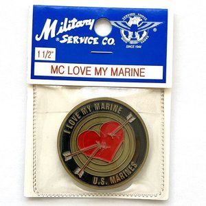 US Marines 'I Love My Marine' Red Heart Target and Arrows Enamel Full Color Challenge Coin & Plastic Case. The reverse says United States Marine Corps, "The Few, The Proud".