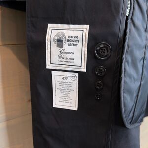 U.S. Military Men's All Weather Coat. Very dark navy blue/black cotton and polyester blend fabric. Zip-out removable liner. Button front. Belted at the waist. Made by American Apparel, Inc. Dated 2014.