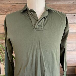 Classic long sleeve military polo style shirt in excellent preowned condition. It measures 22 inches across the chest laying flat and 32 inches in length from shoulder to hem.