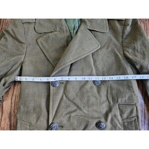 US Military Marine Corps Green Wool Uniform Overcoat Size 34s Goodstein Bros. There is a small hole if the front right collar but is in good condition otherwise. Please note pictures for condition and measurements