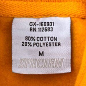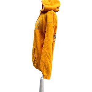 This vibrant yellow hoodie features detailed graphics on the back, offering a bold statement. Made with a cotton-polyester blend for comfort and durability.