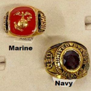 US Navy Ring with red crystal set in heavy 18 karat antiqued gold. Available in Blue also and more Military rings and tacks in closet - NO CLEAR AND GOLD