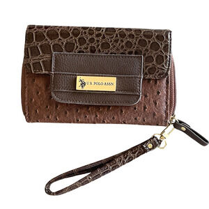 U.S. POLO ASSN Brown Gold Crocodile Embossed Wallet Snap Clutch Wristlet. Detachable Strap. Zip Around with Folder Snap Closure. Interior Logo Fabric. Brand New without Tags. Excellent Condition. Ships within 24 hours.