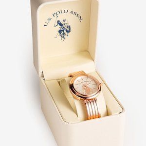 Rose gold sundial with U.S. POLO ASSN. wording and large logo.