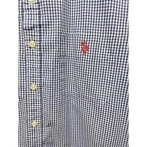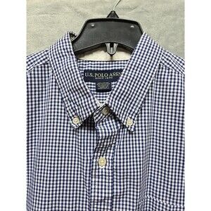 The product is a men's casual button-down shirt from the U.S. Polo Assn. in size XL. It features a blue check pattern, short sleeves, and a button-up front with a pocket on the front. The shirt is designed for regular fit and is perfect for a casual, yet stylish look for men's everyday wear.