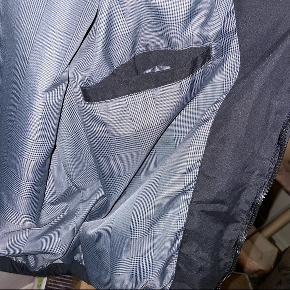 Golf jacket, windbreaker, collared, plaid inside, 2 outer pockets, 1 inner pocket