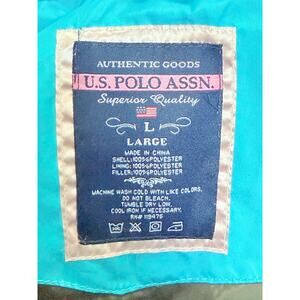 U.S. POLO ASSN. Women’s Puffer Vest L Blue Faux-Fur Hood USPA Logo