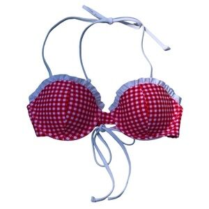 U.S. POLO ASSOCIATION - Red & White Gingham Checked Halter Tie Underwire Bikini Top with White Ruffle Trim - Size Medium. No visible flaws or stains. Excellent preowned condition. LIKE NEW!