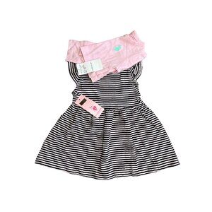 This adorable 3-piece set includes a pink cardigan, a black and white striped dress, and matching leggings. Ideal for stylish and comfortable everyday wear.